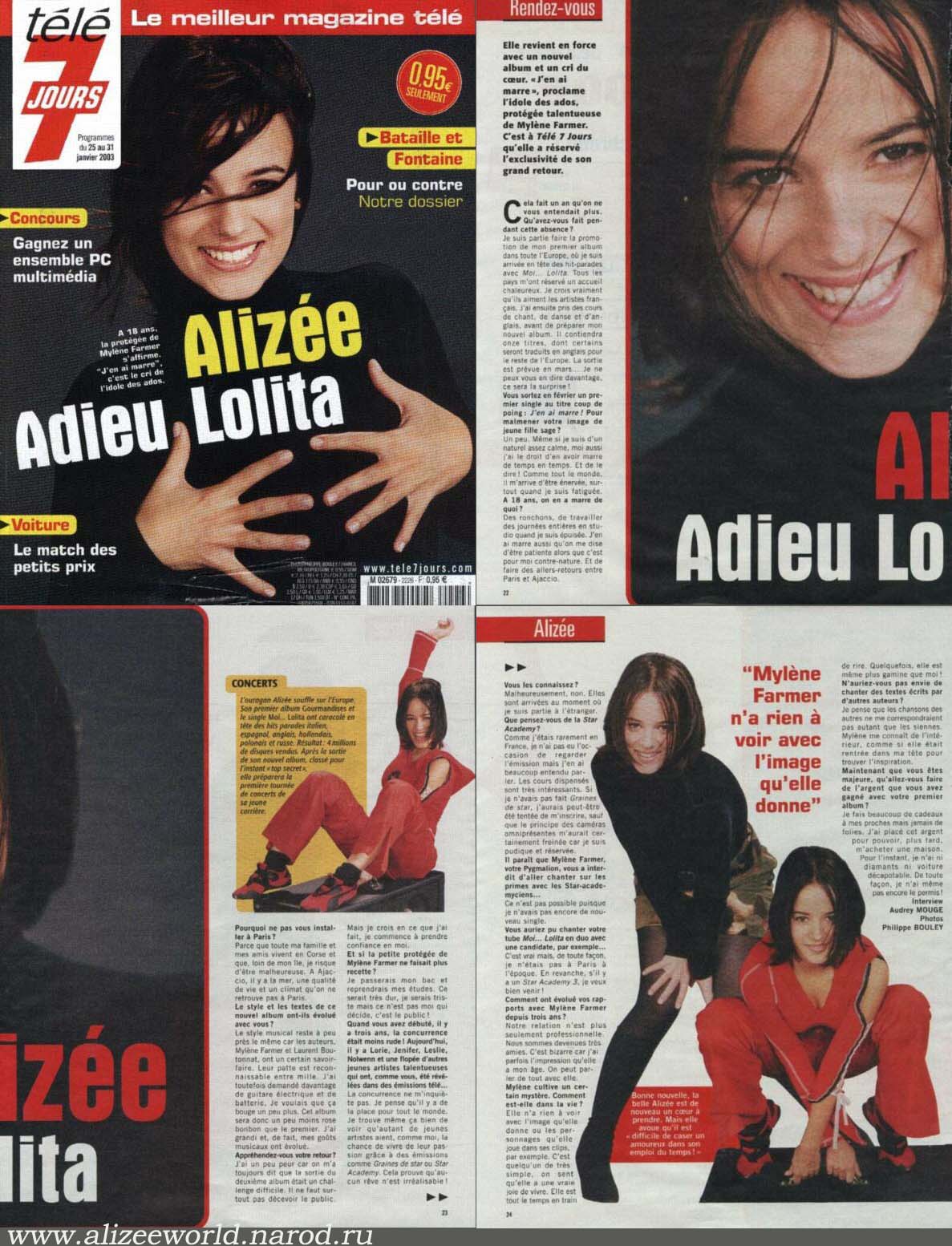 Она возвращается более сильной, со своим новым альбомом и криком сердца «Мне надоело», кумир подростков, талантливая тень Милен Фармер. И только журналу "Теле 7 дней" она поведала о своём большом возвращении, 2003 г.